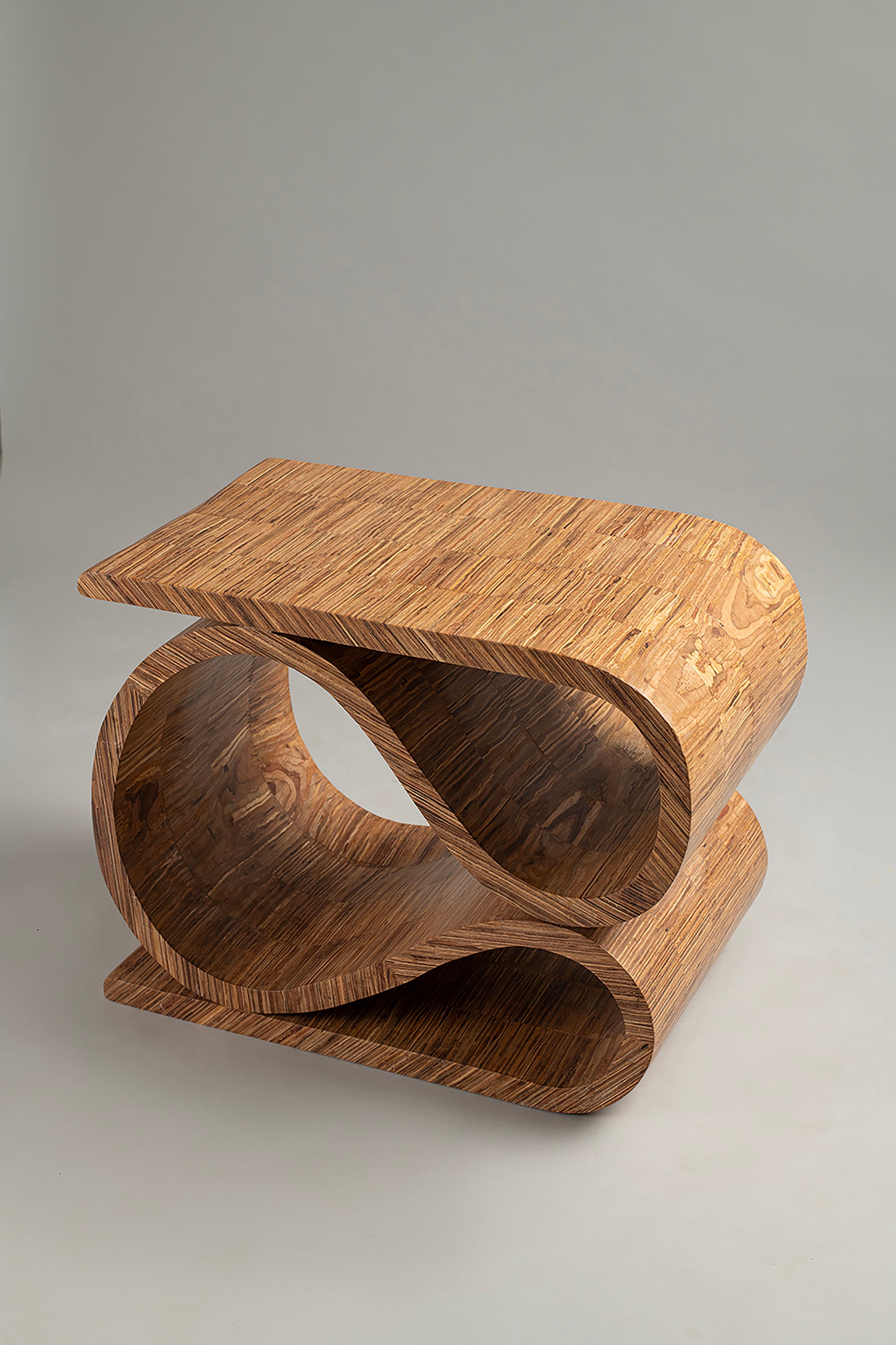 The cascading silhouette is achieved entirely in plywood, with its layered edges emphasizing the upward flow of curves. Compact yet expressive, it stands as both a functional seat and a sculptural accent.